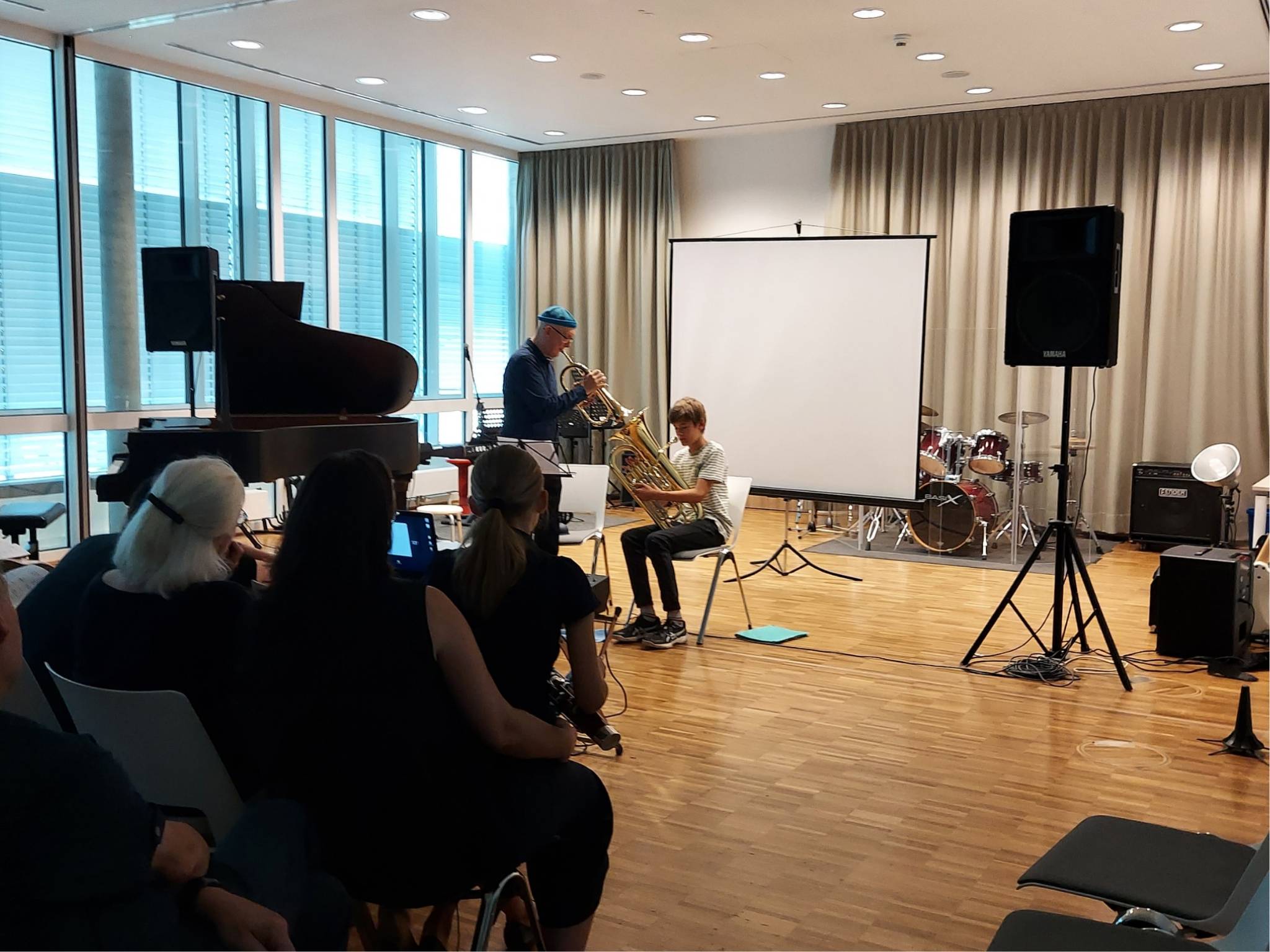 Auch die jüngsten Musikerinnen und Musiker beeindruckten mit ihren Werken: Alfonz Dauer (Fagott) spielte mit seiner Lehrerin Annette Winker sein Stück „Hans auf Safari“, in dem auf den Teilen des zerlegten Fagotts Tiergeräusche erzeugt wurden. Noah Dennett (Klasse Stephen Altoft) hatte ein Duett für Flügelhorn und Euphonium geschrieben. In „For Annie“ ging es um das gleichzeitige Singen und Spielen.